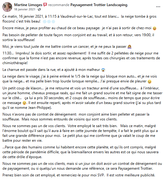 Depuis plus de 15 ans Paysagement-Trottier est fière d’être là quand ça compte le plus. Nous affrontons la tempête pour vous afin de rendre vos déplacements et vos installations accessibles. Notre service de déneigement à Vaudreuil est grandement apprécié. Faites confiance à notre équipe de déneigeurs, guerriers du froid!